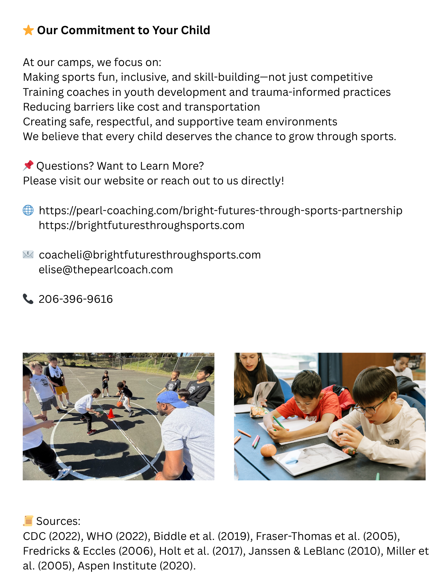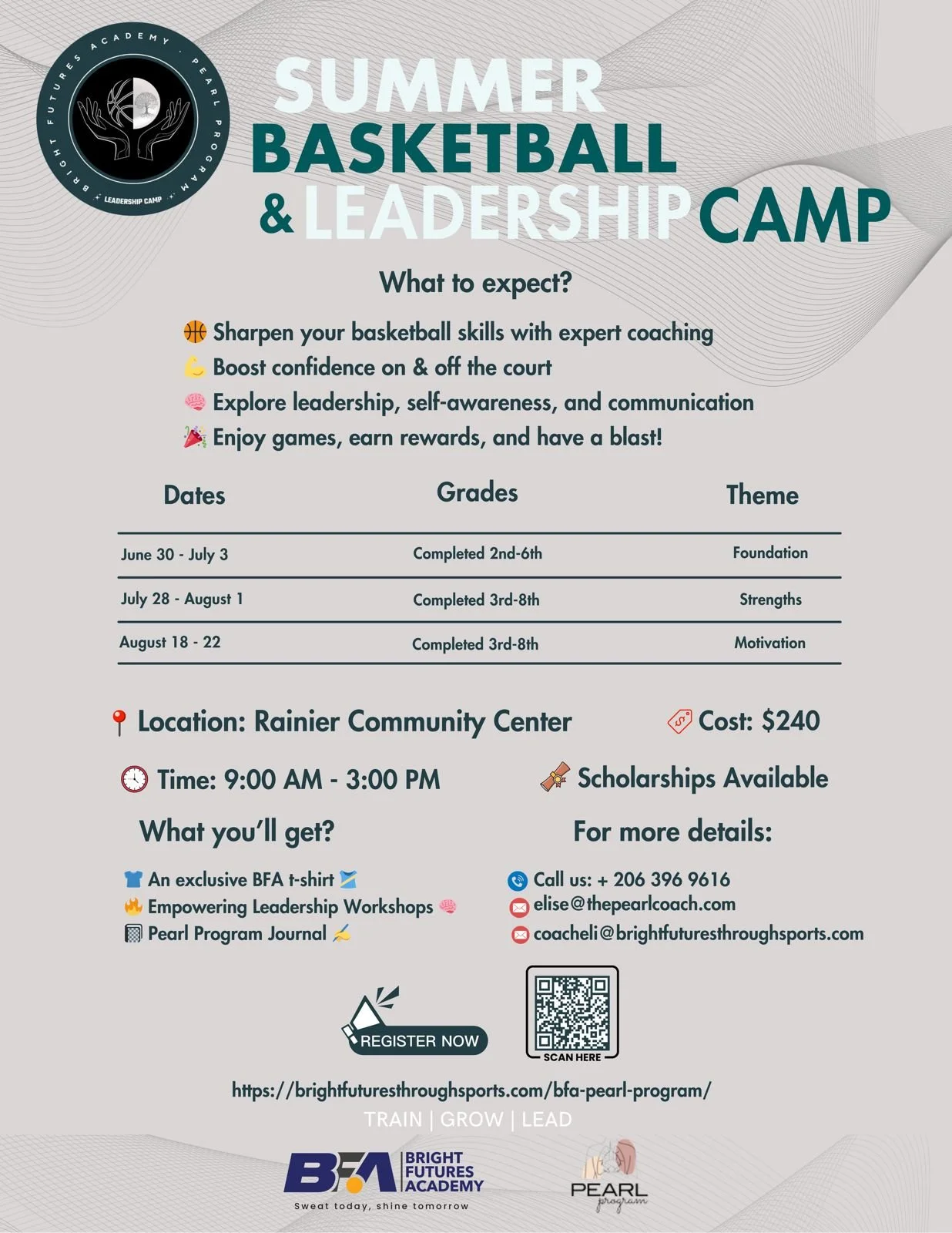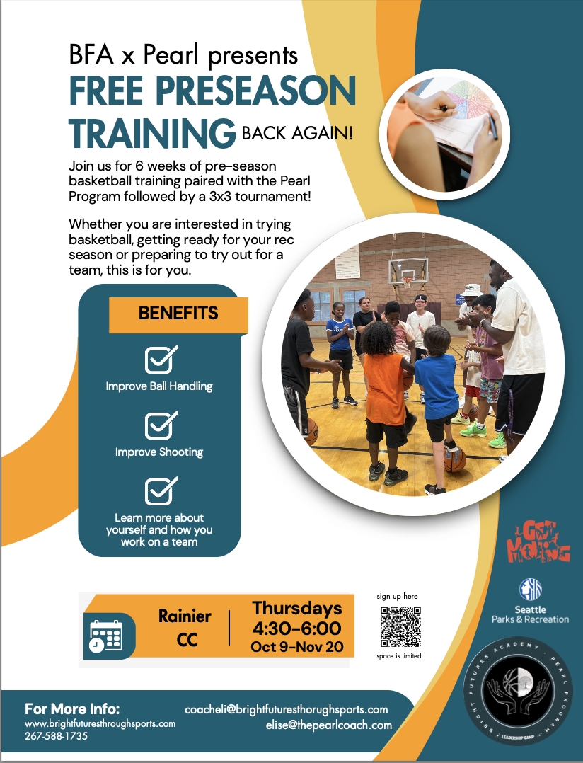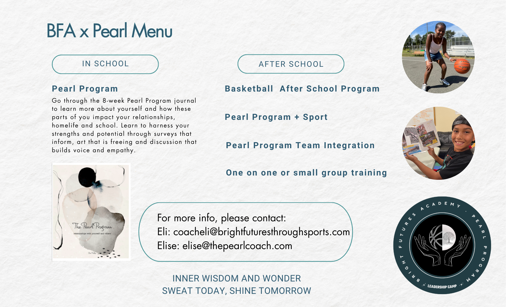 Bright Futures Academy (BFA) and The Pearl Program have partnered to create a transformative youth development program that integrates high-level basketball training with self-discovery through group mentorship. Rooted in the belief that sports are a powerful platform for teaching life skills, fostering resilience, and unlocking opportunities, this program nurtures the whole person—mind, body, and character. This is accomplished through structured basketball training and guided group sessions where athletes work through a Pearl Program journal to learn about their strengths, community and motivation. Young athletes develop self-awareness, confidence, leadership, emotional intelligence, and goal setting skills. By prioritizing holistic growth, we empower youth to excel not only on the court but also in their schools, homes, and communities, shaping them into future leaders.